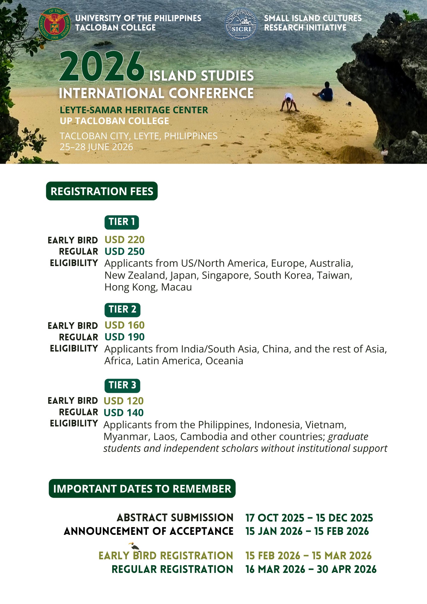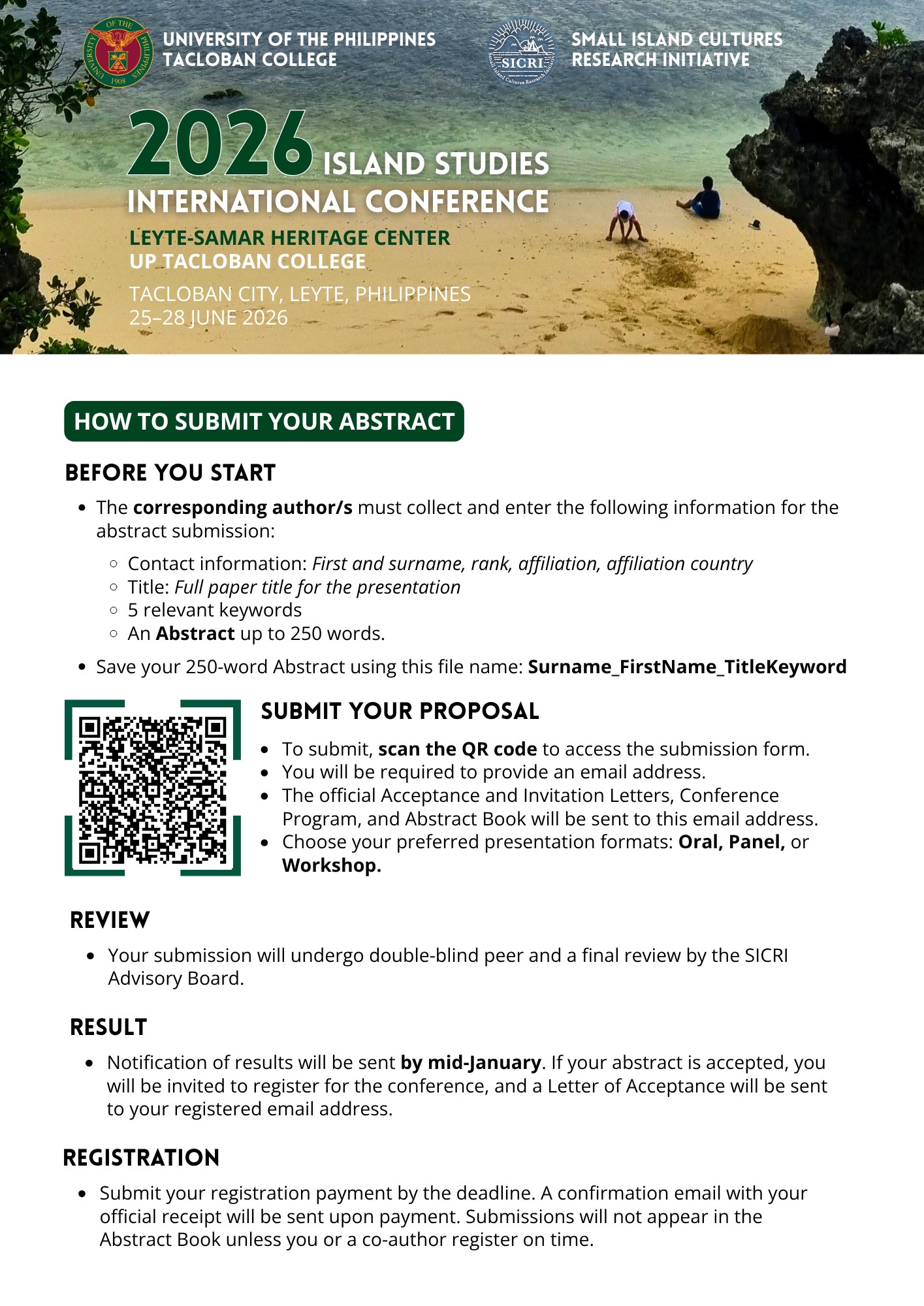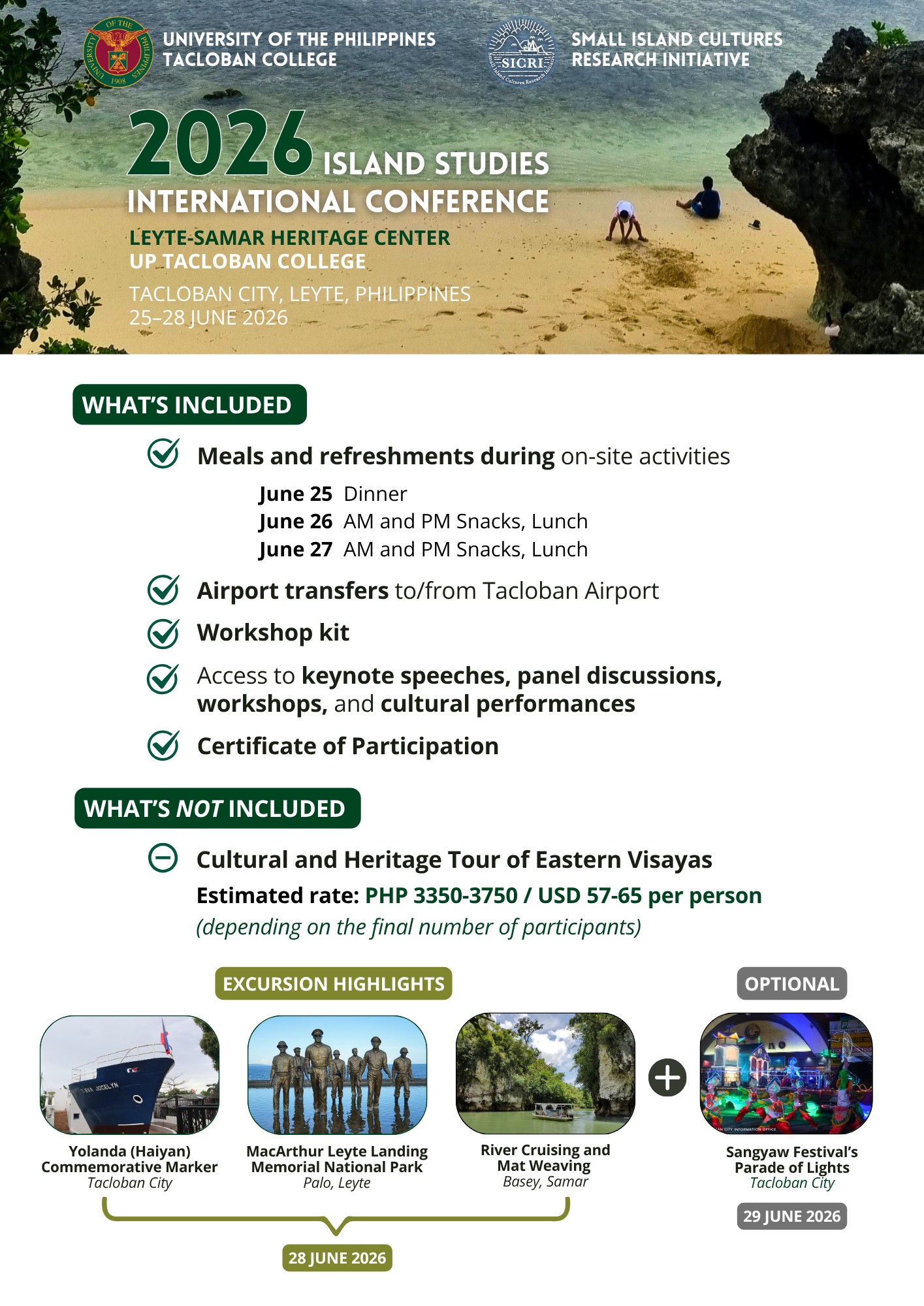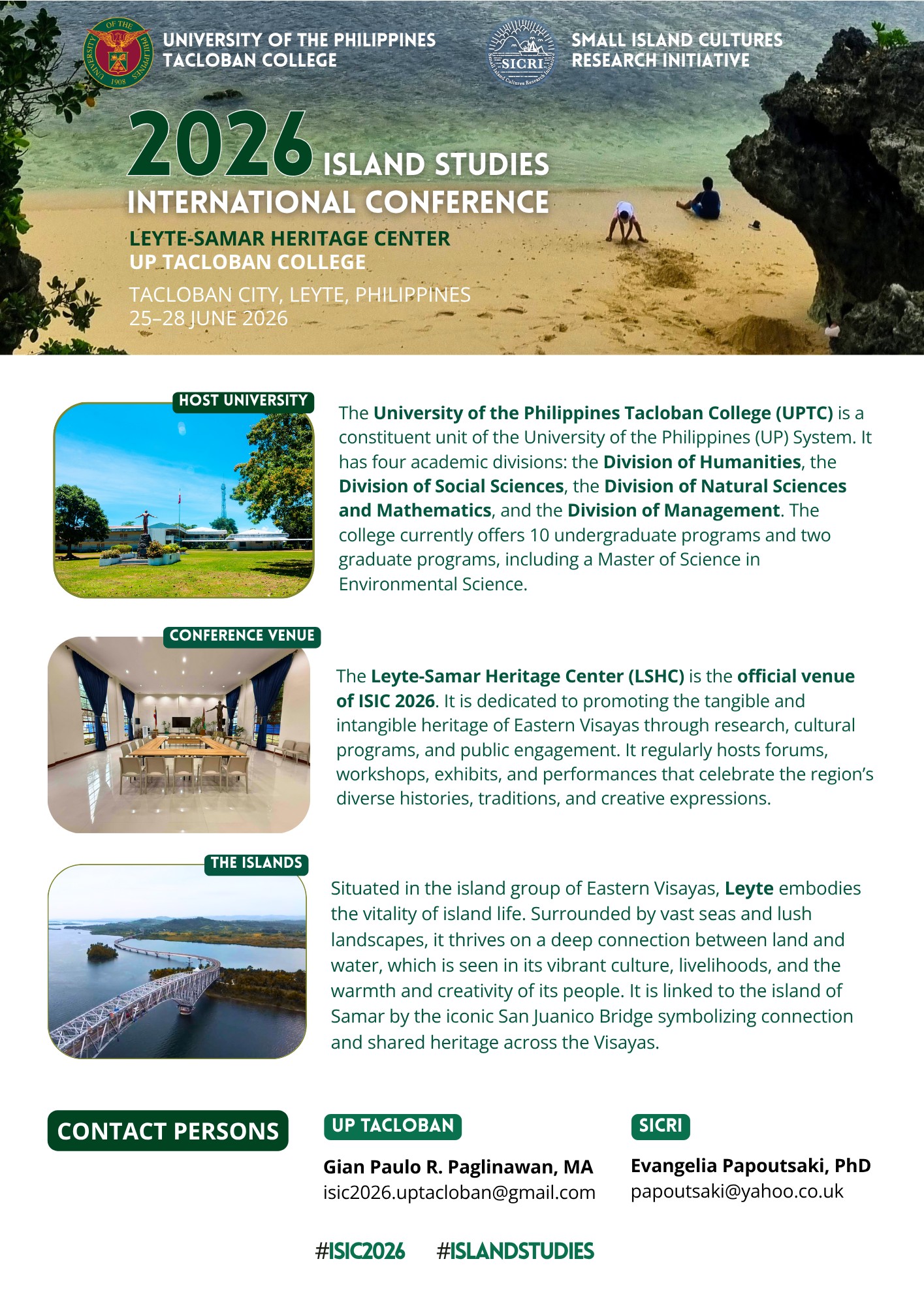 The Small Island Cultures Research Initiative (SICRI) and UP Tacloban College (UPTC) are organizing the 2026 Island Studies International Conference with the theme “Navigating Island Futures: Intersections of Heritage, Transitions, and Regenerative Practices” on 25-28 June 2026 at the UPTC Leyte-Samar Heritage Center, Tacloban City, Philippines.