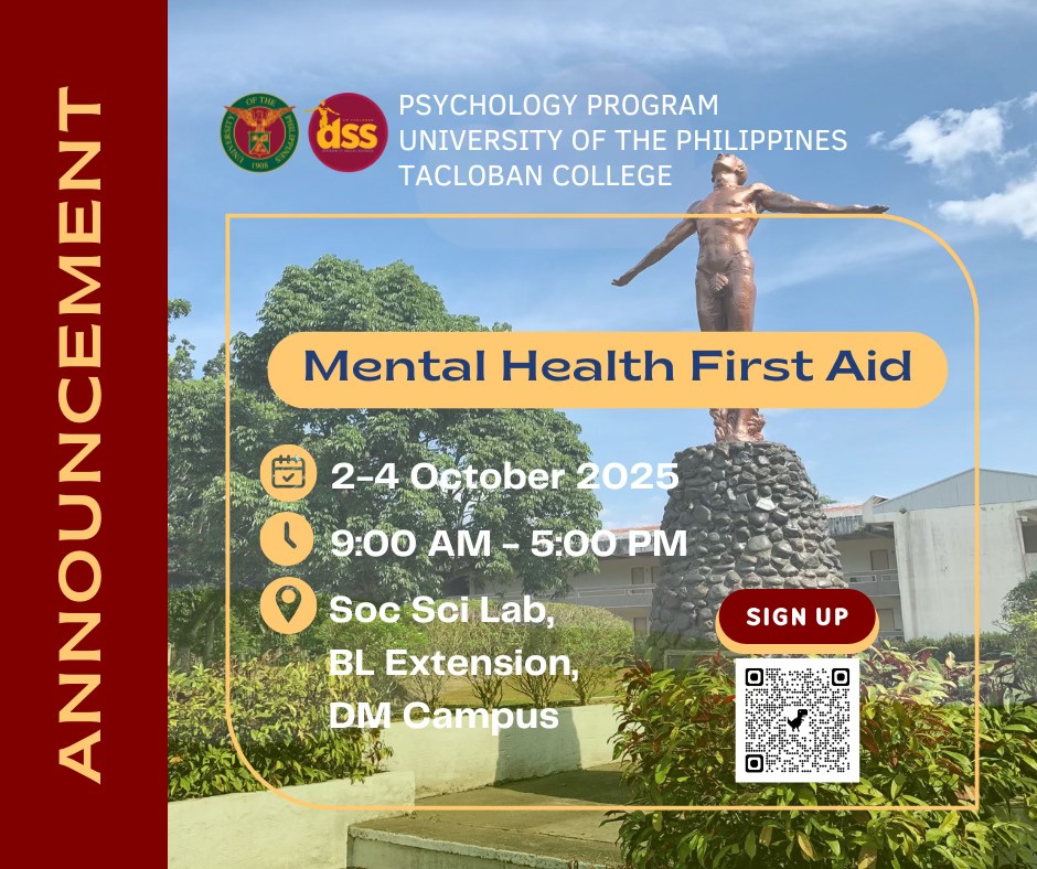 UP Tacloban’s Psychology faculty will offer free Mental Health First Aid to UPTC stakeholders and Tacloban City residents affected by recent disasters, including Typhoon Opong, the Brgy. Sta. Cruz fire, and the 6.7 magnitude earthquake.