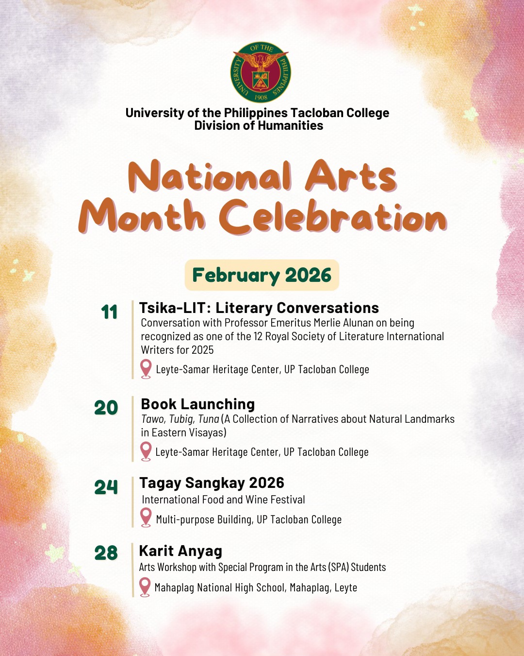 UP Tacloban College, through the Division of Humanities and the Leyte Samar Heritage Center, joins the nation in celebrating National Arts Month with a series of talks, workshops, and cultural events this February 2026. We invite everyone to check out our full schedule of activities and celebrate the arts with us.