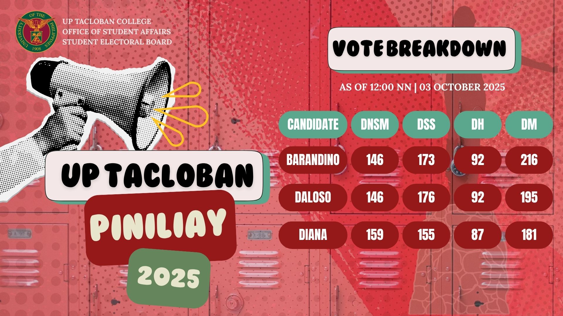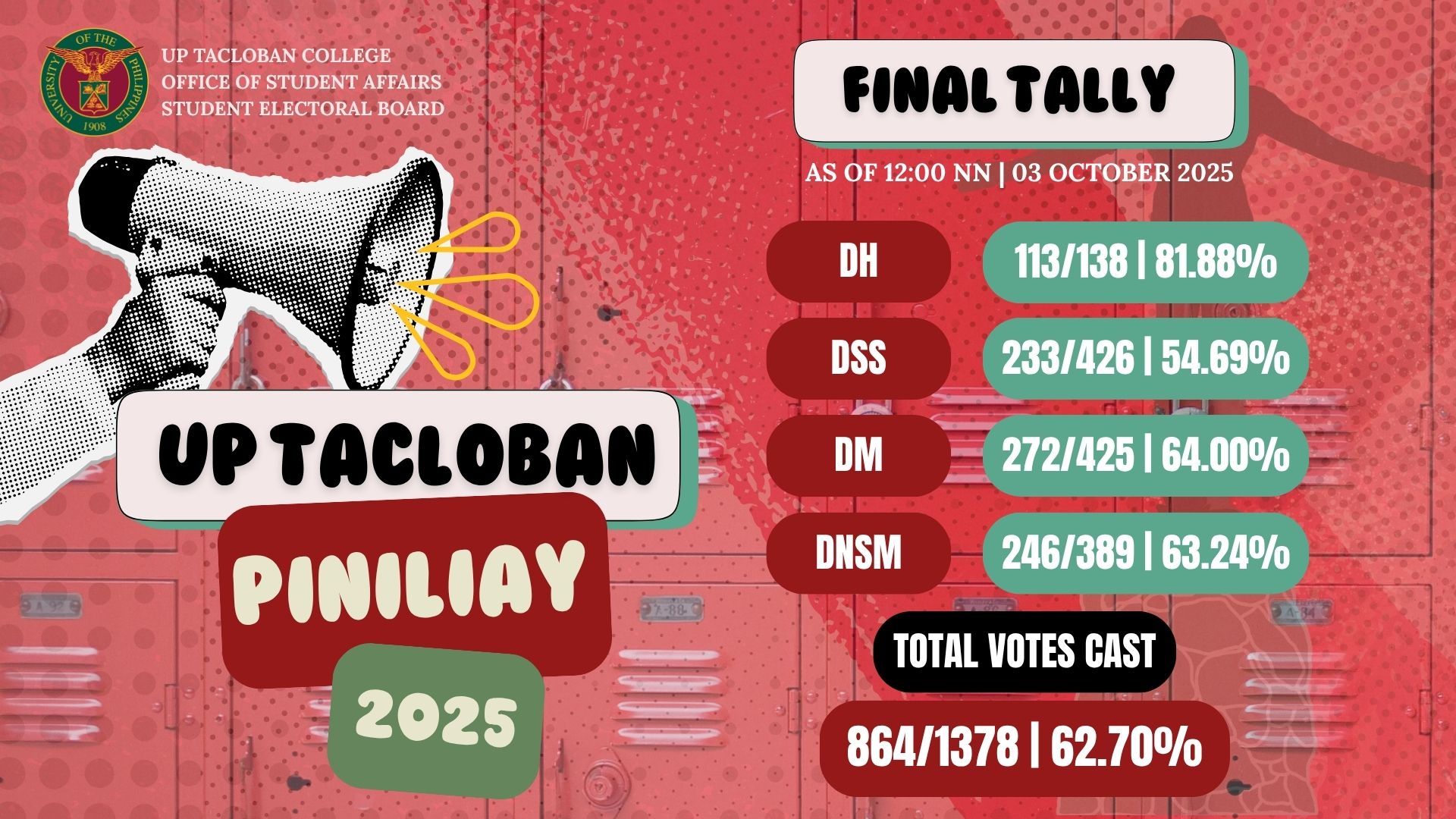The Office of Student Affairs (OSA) and the Student Electoral Board (SEB) hereby announce the official results of UP Tacloban Piniliay 2025.